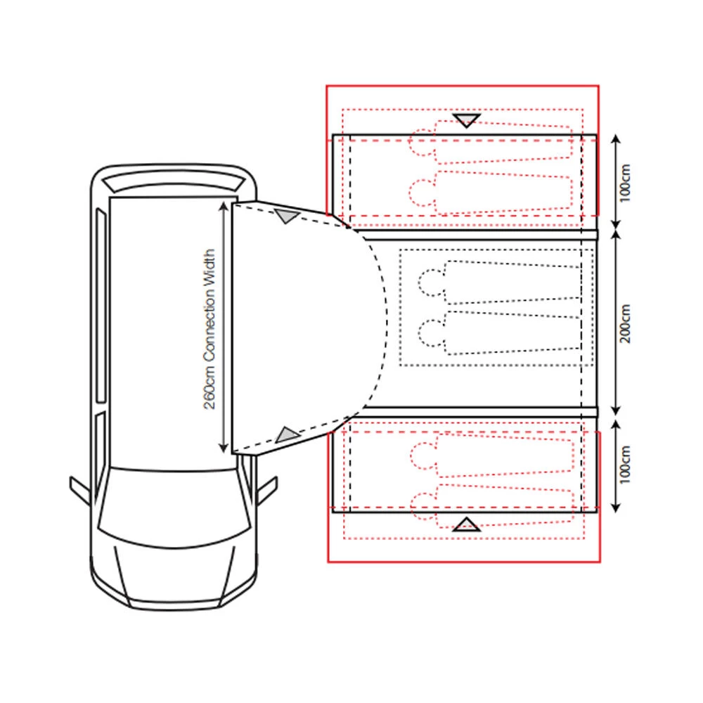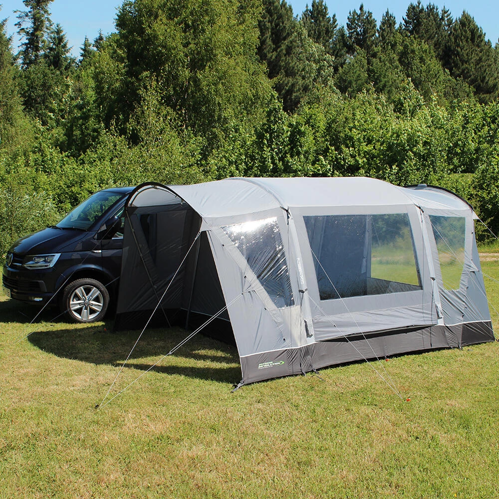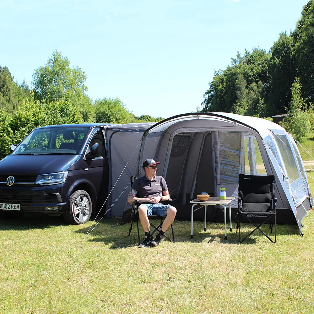 Introducing the innovative and versatile Cayman Combo Air drive-away awning. Its unique design offers mirrored access from both front and back of the awning giving complete flexibility to suit individual needs, this means the awning can be flipped to fit on both left and right sides of a vehicle. This hybrid awning is pitched using both air tubes and poles and is available in two ergonomic cowl height options to offer a great fit to the vast majority of campervan or motorhomes with a rail height of up to 255cm. To further enhance the versatility of this awning an optional Porch Door can be added to the front and/or back to give a fully enclosed usable space outside the main living area. The Cayman Combo Air comes with a wealth of features including a ‘fold-flat’ sewn-in groundsheet, mesh fly screen panels on all doors, and an option to add a 2-berth inner tent. Look no further than the Cayman Combo Air for style and versatility at a great price. Fixing Height 180cm – 210cm (Low). • 120HDE high density all-weather lightweight fabric