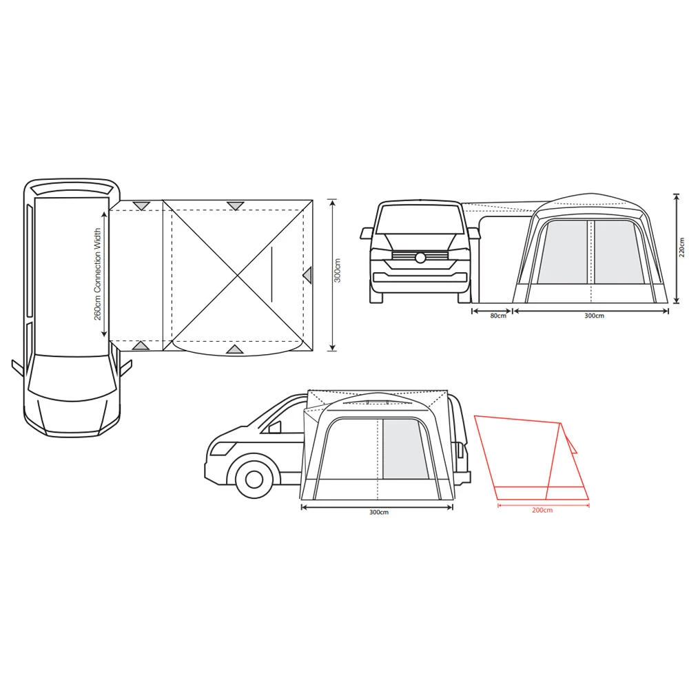 This lightweight pole and sleeve drive-away awning remains the most popular, upper entry-level small family weekender on the market. With just two fibreglass poles used to create the main body of the awning it is quick and easy to pitch, and structurally very stable. The unique design means this is one of the most versatile driveaways on the market, offering access from all sides of the awning through the large roll back doors. Has the option to zip a Cayman Bedroom Annex to the back of the awning, meaning your main living space is not affected if you are looking to add sleeping space. Available in Three ergonomic cowl heights to suit the vast majority of campervans & motorhomes, the Cayman F/G offers unrivalled value for money. Including a ‘fold-flat’ sewn-in groundsheet, and lots of ventilation with plenty of mesh fly screen panels, this is the awning of choice for smaller touring families, couples or independent adventurers, who crave more usable space alongside their van, to meet a budget. Fixing Height 180cm – 220cm (Low). • 120HDE high density all-weather lightweight fabric