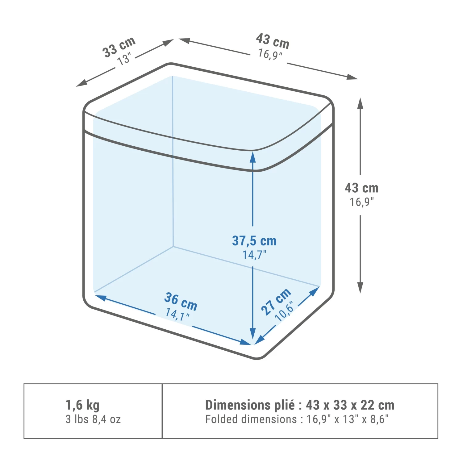 When unfolded, the cooler measures 43 cm in height, 33 cm in depth and 43 cm in width.