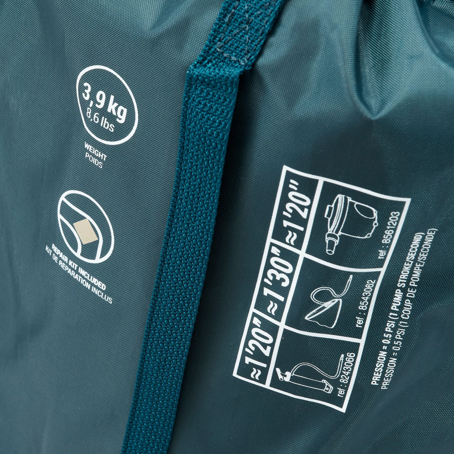 The ideal inflation for this kind of mattress is generally moderate (0.02 BAR or 0.3 PSI), which, when you are sitting on the mattress, allows you to feel the ground under you. Once you lie down, the mattress will fit around your body and therefore provide the best comfort. We recommend using a pump type: Quechua 5.2 L red (8243066) which is our most efficient and leading model.
